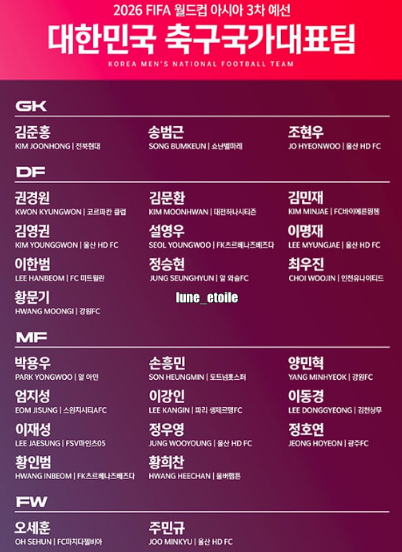 대한민국 대표팀의 이번 쿠웨이트전 출전 명단은 경기 직전에 공식 발표될 예정이지만, 주요 선수들의 명단에는 큰 변화가 없을 것으로 보입니다. 특히 손흥민(토트넘), 이강인(파리 생제르맹), 황희찬(울버햄튼), 김민재(바이에른 뮌헨) 등 주요 해외파 선수들이 여전히 대표팀의 핵심으로 활약할 전망입니다. 또한 **배준호(스토크시티)**와 주민규(울산현대) 등 최근 좋은 활약을 펼친 선수들이 포함될 가능성도 큽니다.