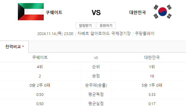 • 11월 14일 쿠웨이트와의 경기는 대한민국의 월드컵 본선 진출 가능성을 높일 중요한 경기입니다. 쿠웨이트는 최근 약화된 전력으로 대한민국에 도전하지만, 방심은 금물입니다. 대한민국이 승리한다면, 본선 진출을 위한 중요한 발판을 마련하게 될 것입니다.