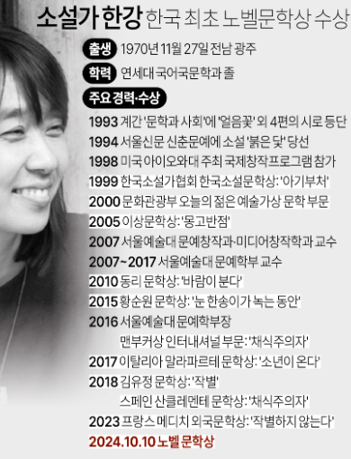 - 이때 한강은 한국인 최초로 맨부커상을 수상하면서 한국 문학의 새로운 가능성을 제시했습니다. 이번 노벨 문학상 수상은 한강의 문학적 업적을 세계 문학계에 더욱 각인시키는 계기가 되었습니다.