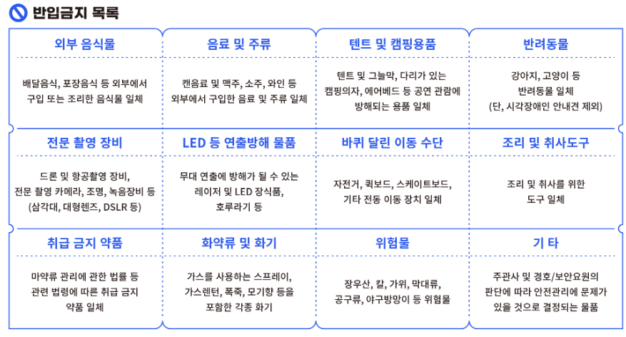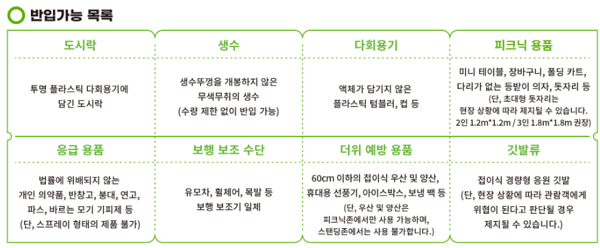 • 유리병 및 캔: 안전사고를 예방하기 위해 유리병과 캔의 반입이 금지되어 있습니다.