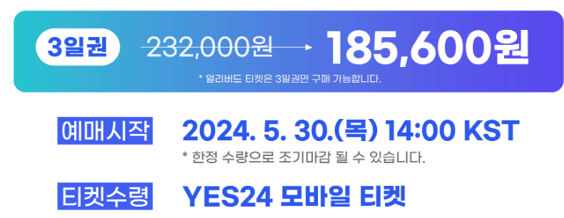 얼리버드 티켓을 통해 3일권을 20% 할인된 가격인 185,600원에 예매할 수 있습니다. 정가에 비해 훨씬 저렴한 가격으로 최고의 라인업을 즐길 수 있는 기회를 놓치지 마세요!