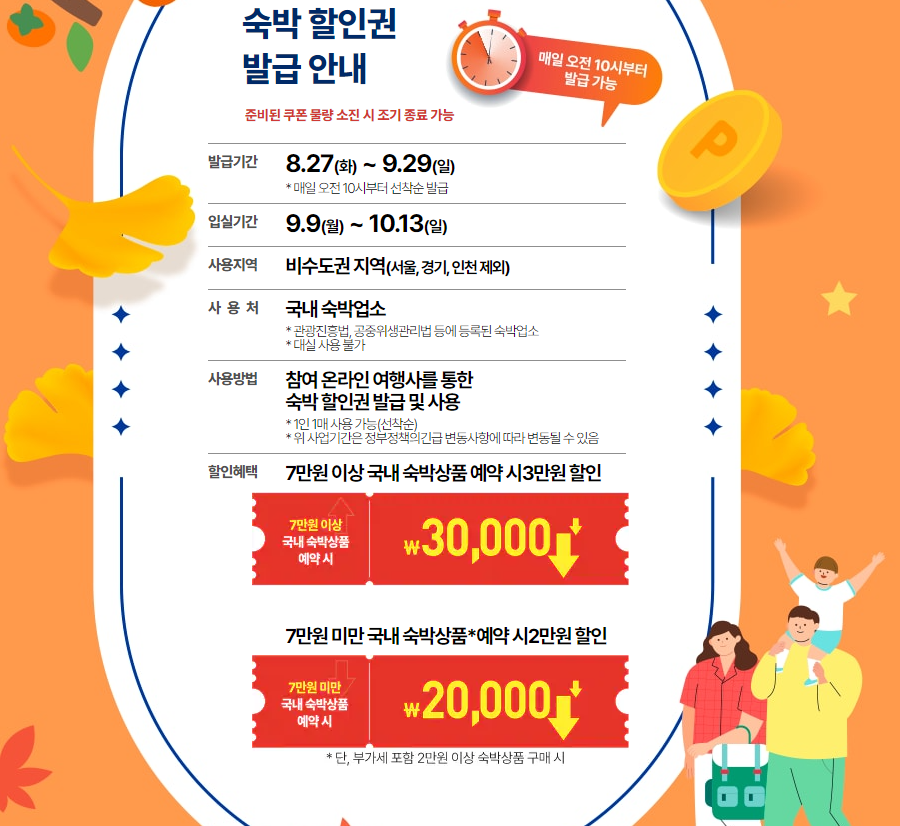 발급된 할인 쿠폰은 **9월 9일(월)부터 10월 13일(일)**까지 사용할 수 있으며, 서울·경기·인천을 제외한 비수도권 지역의 숙박 상품에만 적용됩니다.