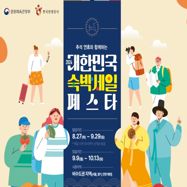 • 2024 추석 숙박 세일 페스타는 민족 대명절인 추석을 맞아 진행되는 대규모 숙박 할인 이벤트로, 국민들의 국내 여행을 촉진하고 지역 경제를 활성화하기 위해 마련되었습니다.