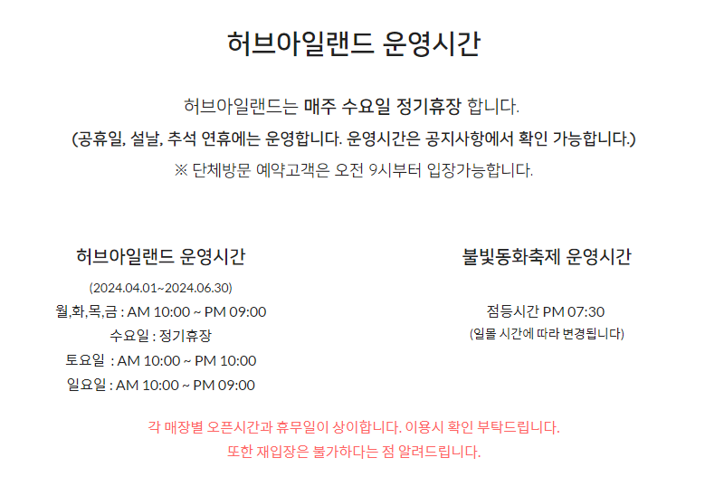 허브아일랜드는 평일과 주말에 따라 운영 시간이 다르니, 입장 시간에 맞춰 방문하는 것이 좋습니다. 특히 야간 개장 시 불빛동화 축제를 즐기려면 저녁 7시 30분 이후에 방문하는 것을 추천합니다.