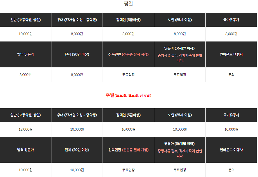 • 주말 입장권: 성인 12,000원 / 중학생 이하 10,000원