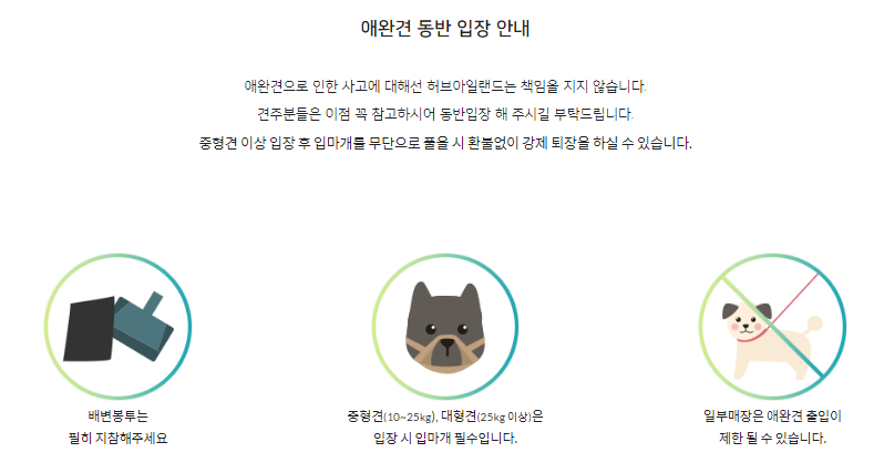 허브아일랜드는 반려동물 동반이 가능합니다. 다만 중형견(15kg 이상)의 경우 입마개와 리드줄(1.5m 이하)이 필요하니, 방문 전 준비를 해주세요.