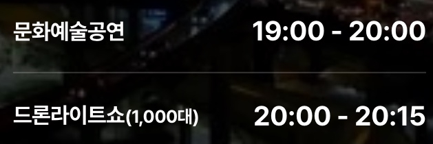 - 한강 드론쇼의 시간은 오후 8시부터 15분 동안으로 예정되어 있습니다. 그러나 인근에서 문화예술공연이 있을 예정이니 오후 7시부터는 축제 분위기를 느낄 수 있을 것입니다.