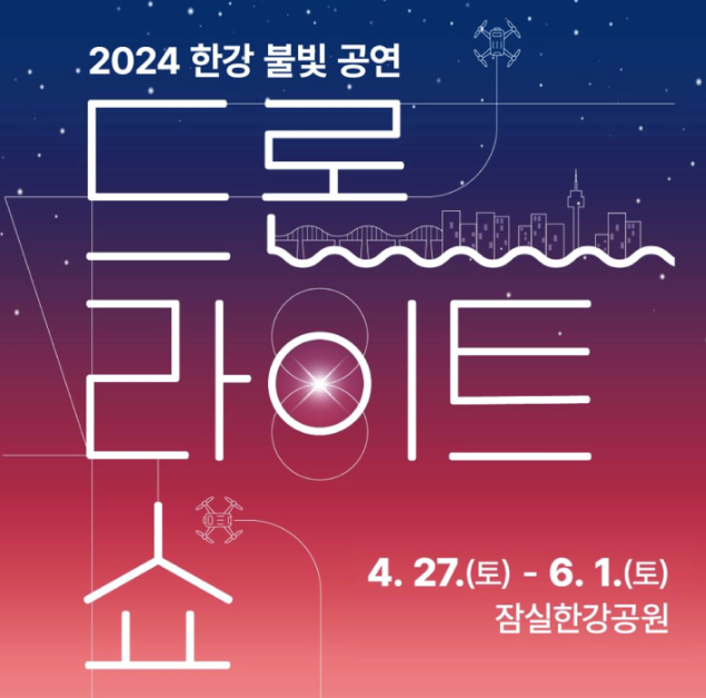 - 드론쇼는 2024년 4월 27일(토)부터 6월 1일(토)까지 이어지며, 다양한 프로그램으로 구성됩니다. 오후 7시부터는 잠실한강공원과 뚝섬한강공원 인근에서 문화예술공연이 진행되어 축제 분위기를 조성할 예정이며, 이어서 밤 8시부터 8시 15분까지는 멋진 드론 라이트 쇼가 펼쳐집니다.