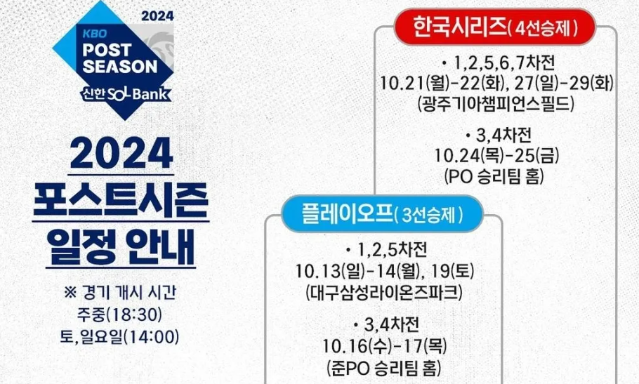 2024 한국시리즈가 드디어 열립니다! 이번 시리즈는 7전 4선승제로 진행되며, 팬들의 뜨거운 관심이 예상됩니다. 경기는 **10월 20일(토요일)**부터 시작되며, 각 팀의 성적에 따라 다양한 경기장에서 열릴 예정입니다. 기아 타이거즈의 홈경기는 광주-기아 챔피언스 필드에서 개최될 가능성이 높습니다.
