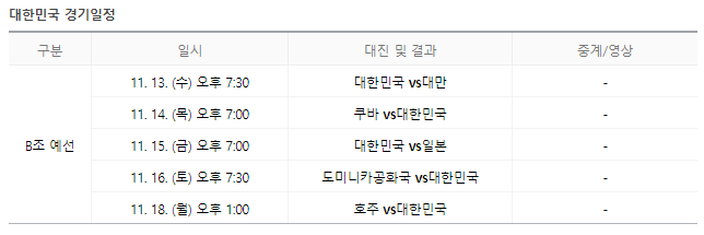 - 11월 14일: 대한민국 vs 쿠바 (타이베이 시립 톈무 스타디움)
