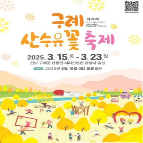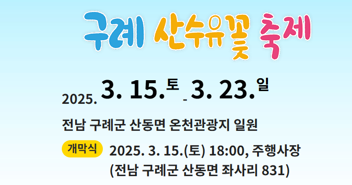 산수유꽃이 절정을 이루는 시기에 맞춰 매년 구례 산수유축제가 열립니다. 2025년 축제 일정은 다음과 같습니다.