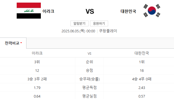 - 양 팀 FIFA 랭킹: 대한민국(현재 20위), 이라크(현재 60위)