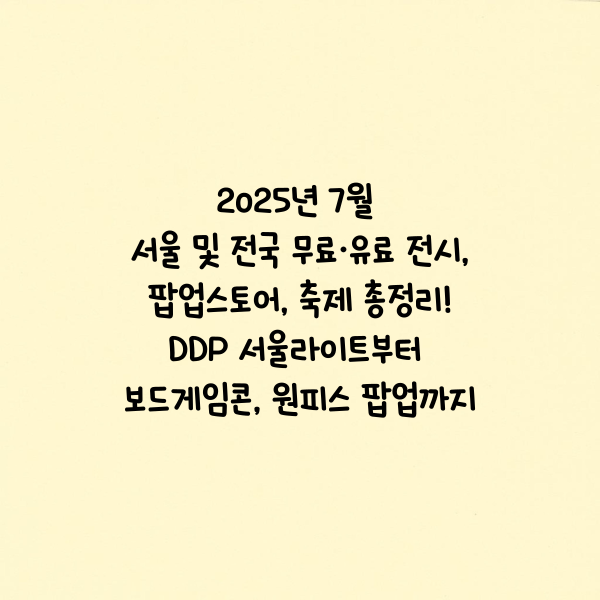 여름방학과 휴가철이 본격적으로 시작되는 7월! 무더위를 잊게 해줄 다양한 문화 행사와 이색 팝업스토어, 여름축제가 서울과 전국 곳곳에서 펼쳐지고 있습니다. 가족 단위 관람객부터 MZ세대까지 모두 즐길 수 있는 2025년 7월 주요 행사 정보를 모아봤습니다. 무료 입장이 가능한 프로그램부터, 유료 전시와 축제까지 총망라된 이 포스팅을 통해 알차게 여름을 즐겨보세요!