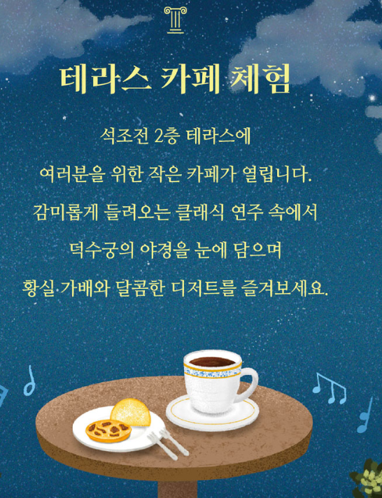 - 석조전 테라스 카페 체험에서는 고종 황제가 즐겼던 '가배(커피)'와 다과를 맛보며 클래식 연주를 감상할 수 있습니다.