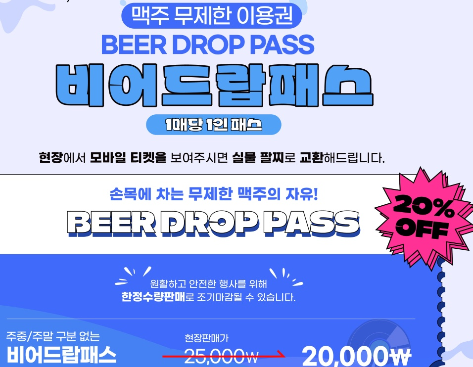 - 별도 예매: 맥주와 음식 이용, 테이블 확보 등을 위해 ‘쿠폰북’, ‘비어드랍패스’, ‘테이블 예약’ 상품 구매 가능