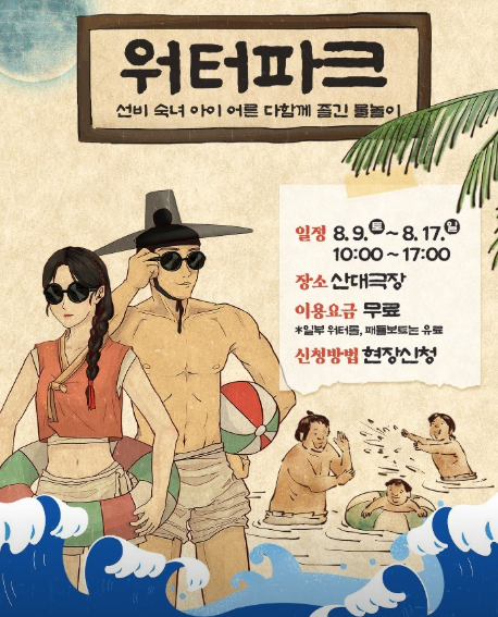 여름축제의 꽃, 워터파크는 8월 9일부터 17일까지 매일 오전 10시부터 오후 5시까지 운영됩니다. 전통의상 선비와 숙녀로 분한 체험진들과 함께 시원한 물놀이를 즐길 수 있으며, 아이들을 위한 얕은 풀과 슬라이드, 물총 놀이 등도 준비되어 있습니다.