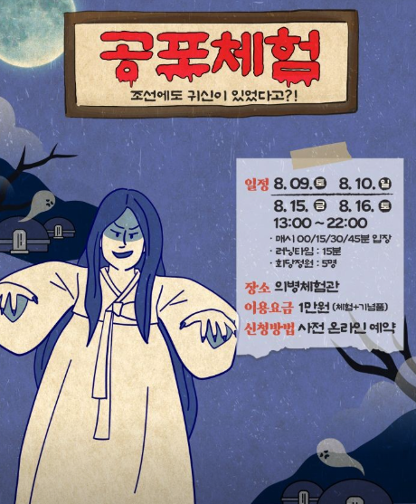 한국형 전통 공포체험으로, 조선 시대의 전설과 설화를 바탕으로 한 귀신 이야기와 미션형 체험이 준비되어 있습니다.