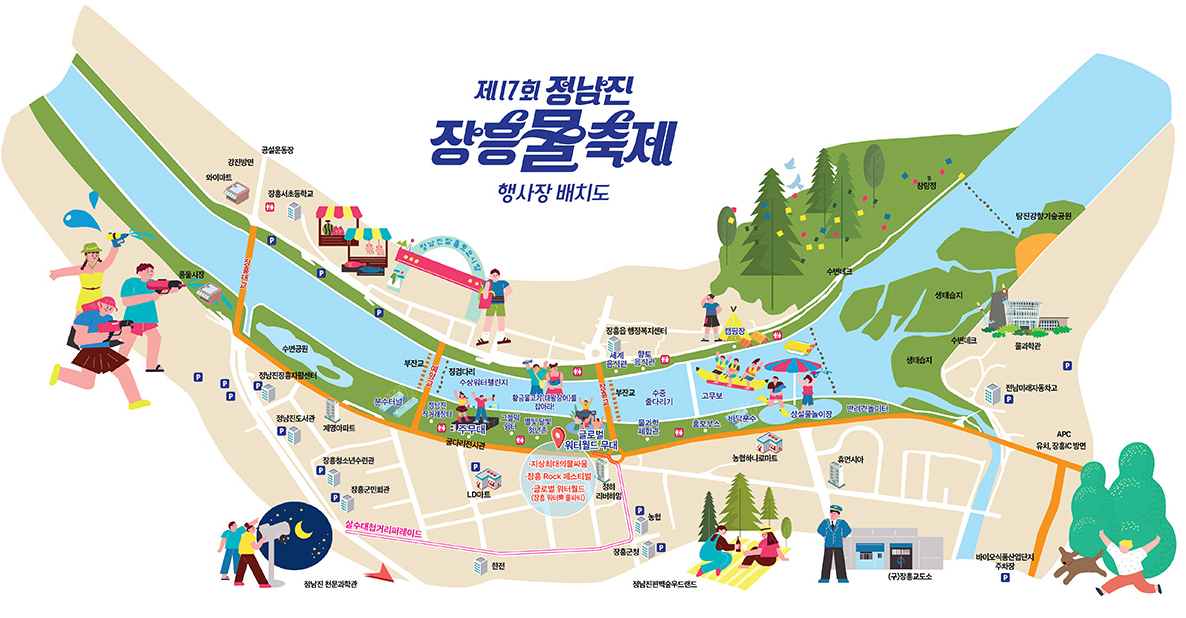 탐진강의 맑고 시원한 물에서 즐길 수 있는 대형 워터 슬라이드, 수중놀이터, 물풍선 배틀 등이 마련됩니다. 남녀노소 누구나 입장 가능하며, 유아 전용 존도 별도로 마련되어 있어 가족 단위 방문객에게 안성맞춤입니다.