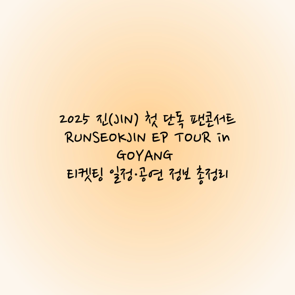2025년 여름, 대한민국 고양에서 시작되는 진(JIN)의 첫 단독 팬콘서트 **‘RUNSEOKJIN_EP.TOUR in GOYANG’**이 전 세계 팬들의 뜨거운 관심을 받고 있습니다. BTS의 맏형 진이 군 복무를 마치고 팬들과의 첫 만남을 준비하며, 그만의 음악 세계를 진정성 있게 펼치는 자리인 만큼 기대가 큽니다.