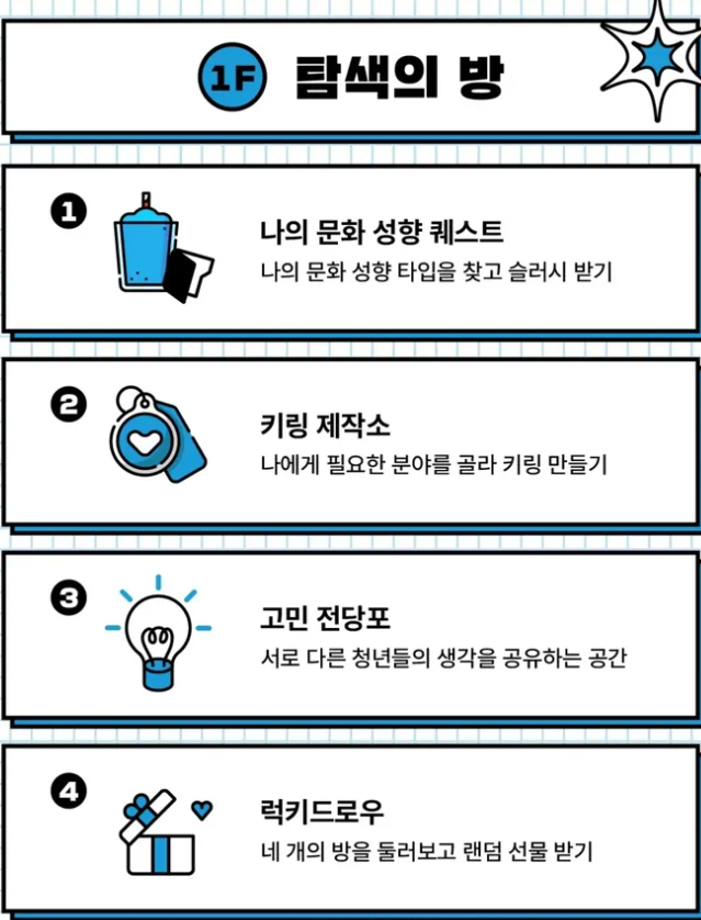 - 방별 테마 체험 : 사진, 음악, 미디어 아트, 글쓰기 등