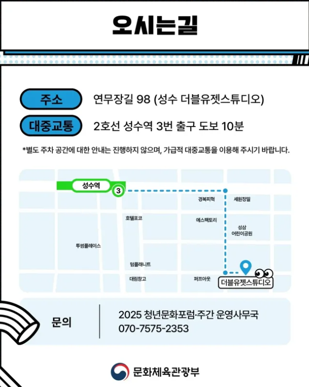 - 연락처 : 2025 청년문화포럼·주간 운영사무국 ☎ 070-7575-2353 (평일 10:00~17:00)