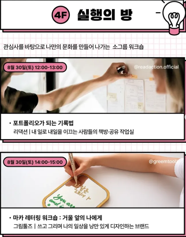 - 짧지만 강렬한 워크숍 : 30분~1시간 소규모 그룹 참여 가능