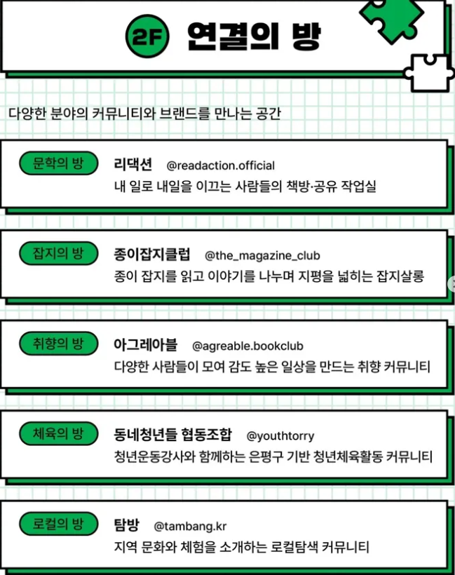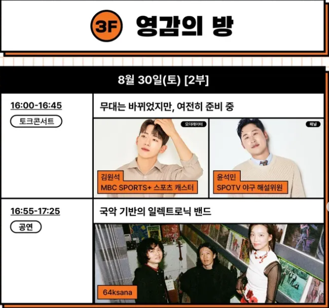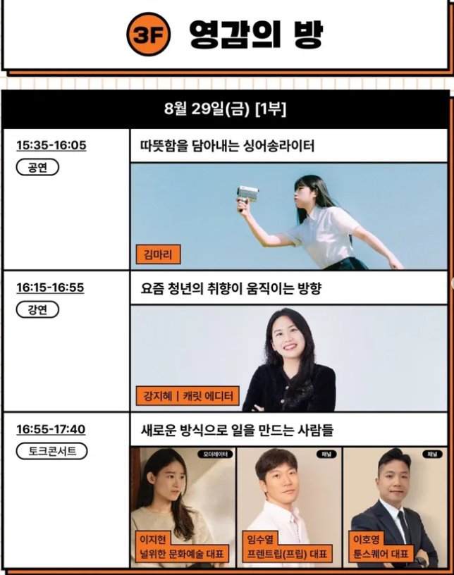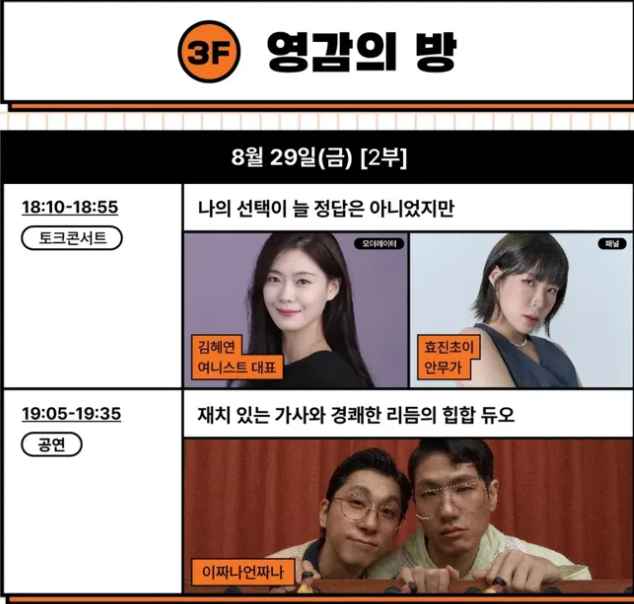 효진초이, 이짜나언짜나, 윤석민 등 다양한 분야에서 활약하는 인물들과의 만남뿐 아니라, 방별로 기획된 테마 체험과 공연, 네트워킹을 통해 새로운 인연과 영감을 얻을 수 있는 절호의 기회이죠.
