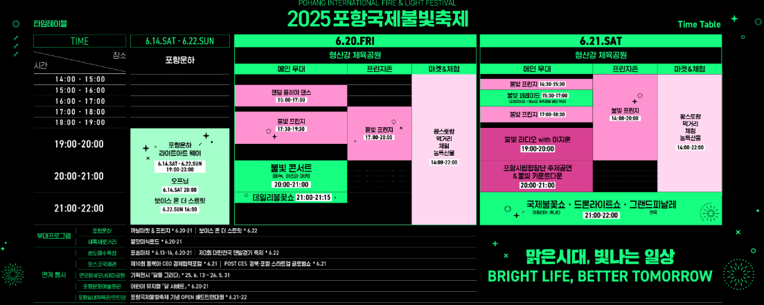2025 포항국제불빛축제는 주말을 포함한 9일 동안 개최되며, 축제 기간 내내 포항운하 일대는 빛과 예술, 음악, 먹거리로 가득합니다. 하이라이트는 6월 21일(토) 국제 불꽃쇼로, 그날을 중심으로 여행 계획을 세우는 것이 좋습니다.