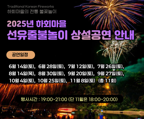 안동 하회마을에서 펼쳐지는 2025 선유줄불놀이는 단순한 불꽃놀이가 아니라, 한국 전통과 자연, 예술이 융합된 독보적인 문화 콘텐츠입니다.