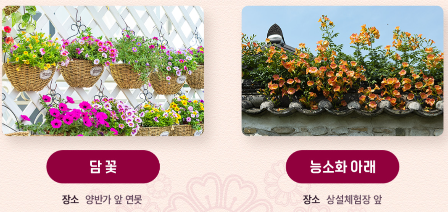 - 🏮 담꽃길: 담벼락에 피어난 꽃과 전통 소품이 어우러진 산책로