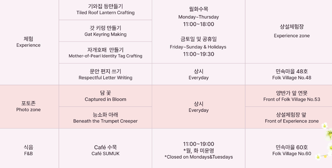 - 🏮 담꽃길: 담벼락에 피어난 꽃과 전통 소품이 어우러진 산책로