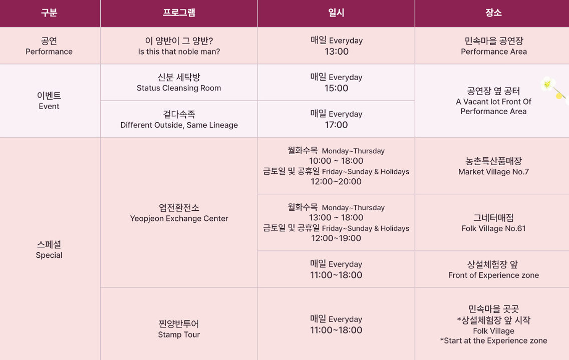 - ⏰ 공연 시간: 매일 오후 1시, 민속마을 공연장