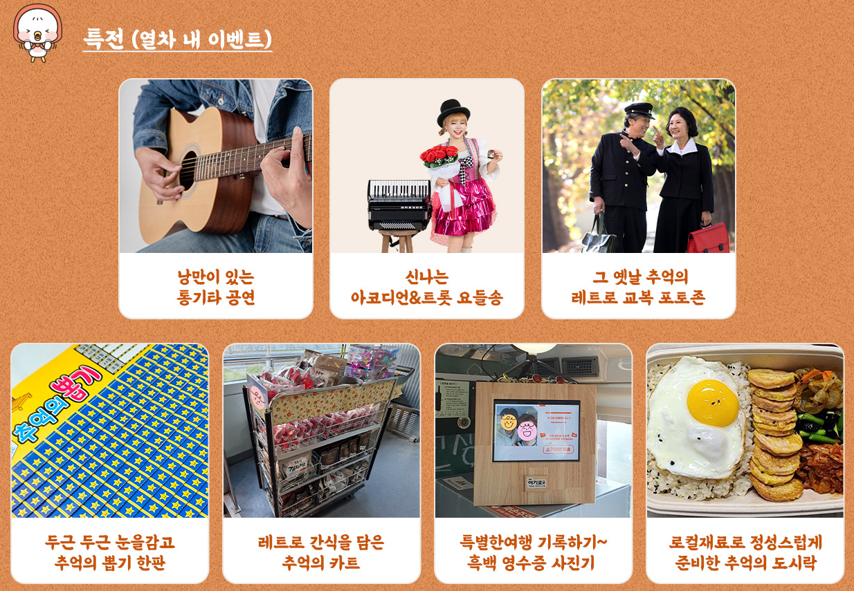 - 통기타 라이브 & 아코디언 연주: 전 구간 정차 후 탑승 완료 시 본격 시작