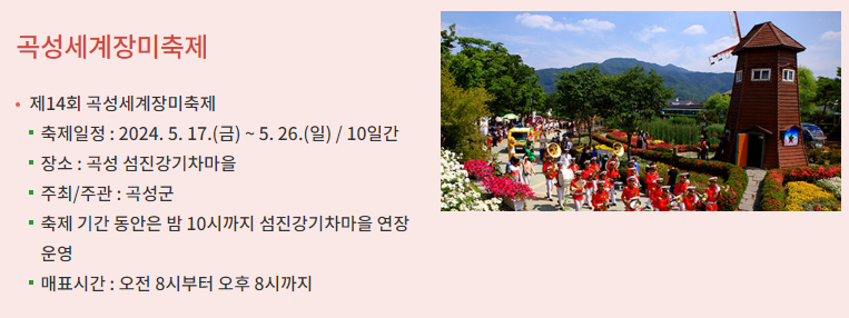 - 한국을 대표하는 화려한 봄 축제, 곡성 세계장미축제가 다가왔습니다! 매년 5월에 곡성 섬진강 기차마을에서 열리는 이 축제는 매년 30만명 이상의 관광객이 찾는 대규모 행사입니다. 이번에도 2024년 5월 17일부터 26일까지, 7만 5천여㎡의 부지에는 수억 송이의 장미가 피어나 그윽한 장미향을 풍기게 됩니다.