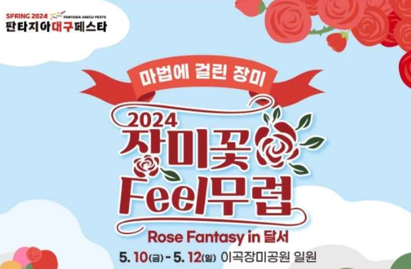 - 대구 이곡장미공원에서 펼쳐지는 '장미꽃 필무렵 축제'가 곧 다가옵니다! 2024년 5월 10일부터 12일까지 이 공원은 더욱 환상적인 모습으로 변신합니다. 유럽의 정원을 연상시키는 싱그러운 장미들이 만발하여 공원을 덮으며, '판타지 인 달서'를 주제로 한 거리예술공원도 함께 운영됩니다.