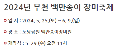 - 부천 백만송이 장미축제에서는 다양한 체험과 이벤트도 함께 진행됩니다. 장미를 활용한 공예 체험, 장미 향수 만들기, 그리고 특별한 장미 칵테일 시음 등 다채로운 활동들이 준비되어 있습니다. 뿐만 아니라 음악 공연과 댄스 공연 등의 이벤트도 함께 펼쳐질 예정입니다.