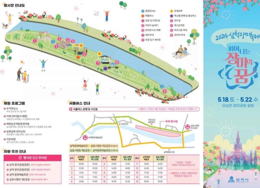 - 장미의 환상적인 세계로 여러분을 초대합니다! 2024년 5월 18일부터 22일까지 강원도 삼척시 삼척장미공원에서 열리는 '삼척 장미축제'가 여러분을 기다리고 있습니다. 이번 축제는 약 8만 6천m²의 규모에 총 222종 16만 주 1천만 송이의 장미가 피어나는 삼척장미공원에서 펼쳐집니다. 이곳은 단일 규모로는 세계 최대 수량의 장미가 자라는 곳으로 손꼽히고 있습니다.