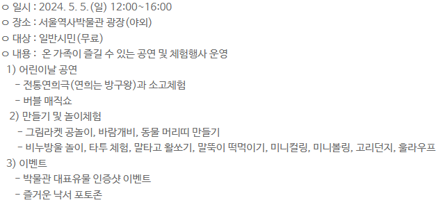 • 어린이날을 맞아 서울역사박물관에서는 전통연희극인 '연희는 방구왕'과 소고 체험, 버블 매직쇼 등 다양한 공연과 체험 행사가 준비되어 있습니다. 이외에도 그림라켓 공놀이, 말타고 활쏘기, 말뚝이 떡먹이기, 고리던지기 등 다채로운 체험들이 준비되어 있어, 어린이와 어른 모두가 함께 즐길 수 있는 행사로서 관심을 끌고 있습니다.