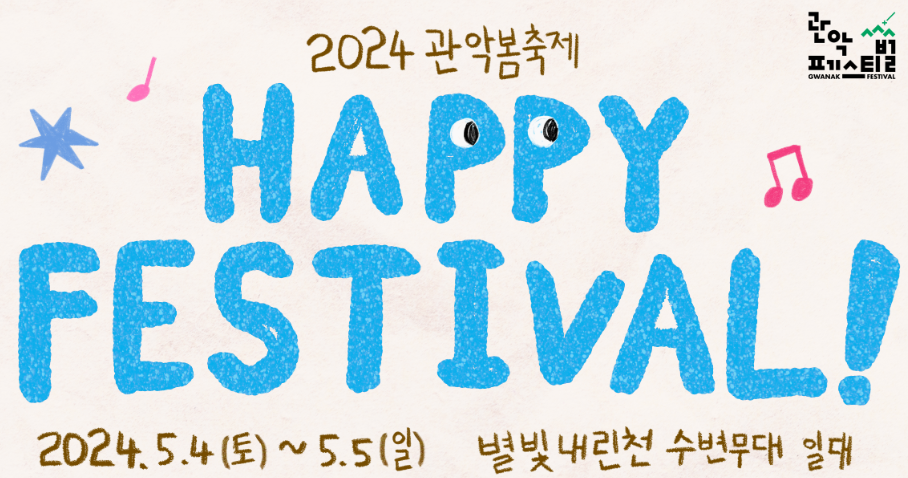 • 서울 관악구 신림동 별빛내린천 일대에서 2024 관악봄축제 HAPPY FESTIVAL이 개최됩니다. 이 축제는 아이뿐만 아니라 어른들을 위한 프로그램도 풍성하게 준비된 전 연령을 위한 축제로, 어린이날을 맞아 5월 4일부터 5월 5일까지 2일간 열립니다.