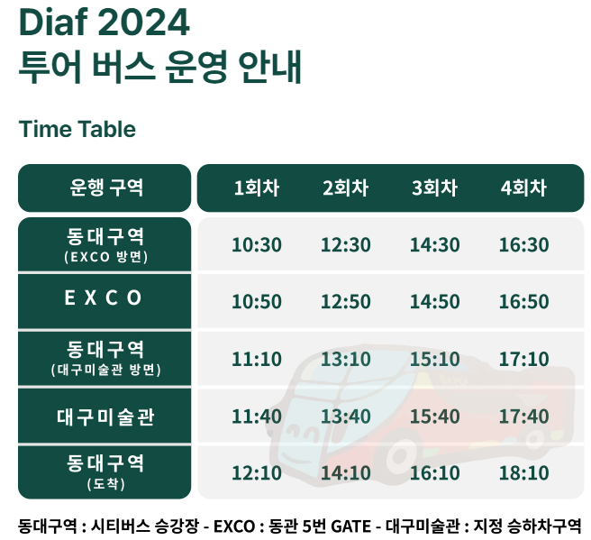 - 대구 아트투어버스를 이용하면 디아프 행사장 뿐만 아니라 대구의 다양한 아트 관련 장소를 편리하게 이동할 수 있습니다. 역사와 현대적인 아트의 조화가 어우러진 동대구역부터 대구를 대표하는 엑스코까지, 또한 대구미술관까지 다양한 아트 문화를 경험할 수 있는 장소들을 편리하게 이동할 수 있습니다.