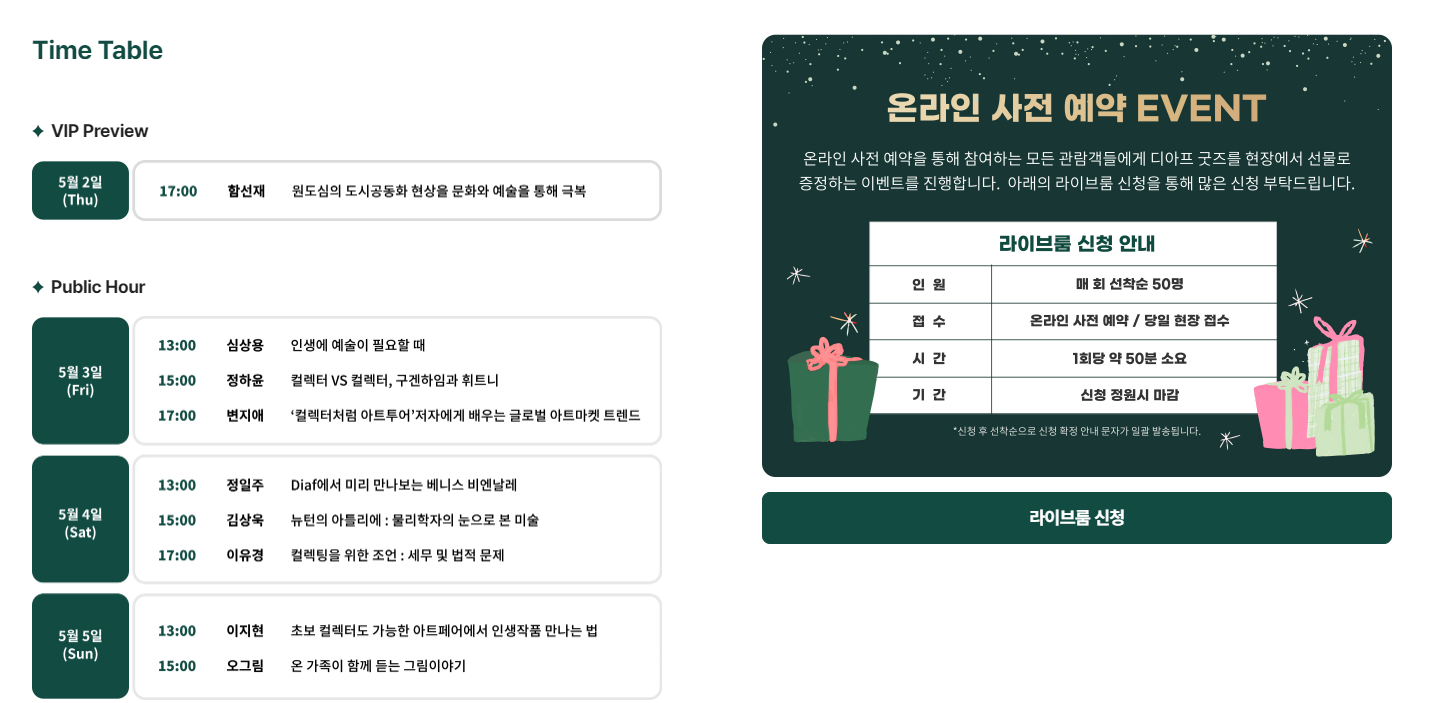 - 정하윤 작가: '꽃 피는 미술관'의 저자로 유명한 정하윤 작가가 첫 컬렉팅 경험담과 컬렉팅 팁을 공유합니다. 그의 이야기는 컬렉터로서의 시선과 경험을 통해 아트를 즐기는 방법을 배울 수 있는 소중한 시간이 될 것입니다.