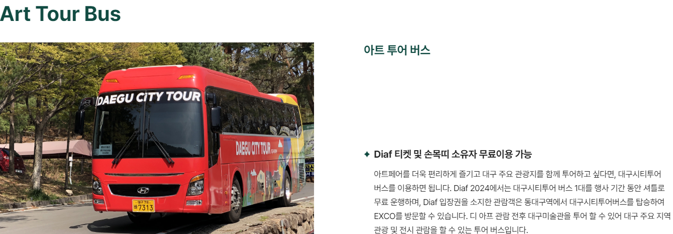 - 디아프(DIAF) 행사 기간 동안, 아트를 즐기고자 하는 이들을 위해 특별한 대구 아트투어버스가 운행됩니다. 이 버스는 동대구역-엑스코-동대구역-대구미술관을 순환하며, 행사 기간 동안 디아프 티켓 소지자에게는 횟수 제한 없이 무료로 이용할 수 있는 특전을 제공합니다.