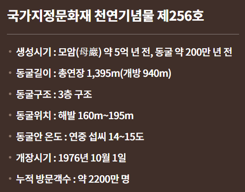 - 특히, 고수동굴은 내부 기온이 연중 안정적으로 15℃를 유지하여, 겨울에도 따뜻하고 여름에는 시원한 동굴 내부를 즐길 수 있는 장점이 있습니다. 이 곳에서는 천연종유석과 동굴산호 등 다양한 자연의 흔적을 만날 수 있어 즐거운 추억을 만들기에 안성맞춤입니다.
