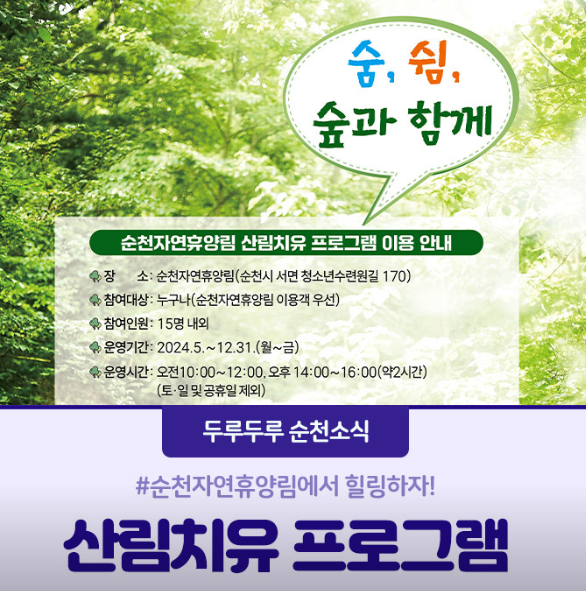 올해 숲을 거닐며 맑은 공기를 마시고, 다양한 치유 프로그램을 체험하고 싶다면 순천자연휴양림의 산림치유프로그램 <숲, 쉼, 숲과 함께>를 추천드립니다. 자연 속에서 힐링과 재충전의 시간을 가져보세요!